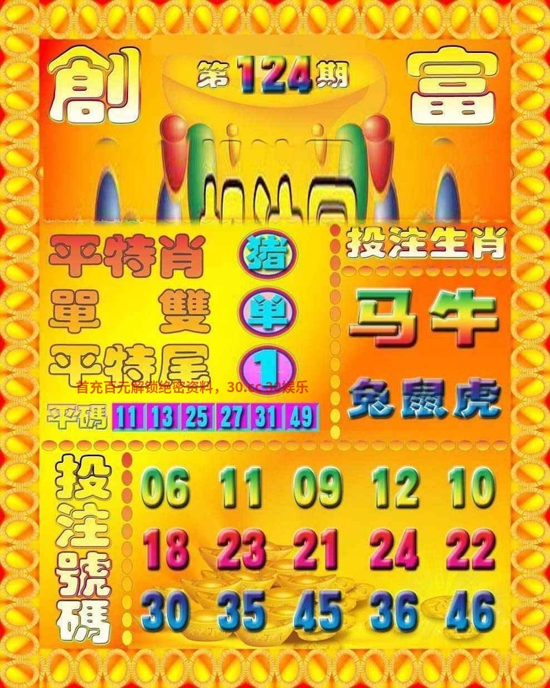 | 125期港彩创富投注解特开(發00) 综合:马牛猴鼠鸡 主特:12.24.05.17.22.34.06.18.33.45 单双:单数 平特肖:龙肖 平特尾:9尾 |
